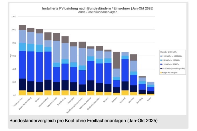 Die Auswertung der installierten PV-Leistung dieses Jahres (Freiflächenanlagen außenvor gelassen) zeigt deutliche regionale Unterschiede. Bundesweit wurden rund 7.060 MWp PV-Leistung auf oder an Gebäuden installiert, davon 67 Prozent in nur vier Bundesländern. Nordrhein-Westfalen und Bayern führen mit jeweils über 1.300 MWp den Zubau an, gefolgt von Baden-Württemberg und Niedersachsen. Am unteren Ende der Skala stehen die Stadtstaaten Bremen und Hamburg, wo die geringe Dachverfügbarkeit, hohe Altbaubestände und restriktive Denkmalschutzauflagen den Zubau erwartbar einschränken.