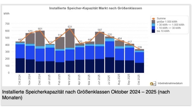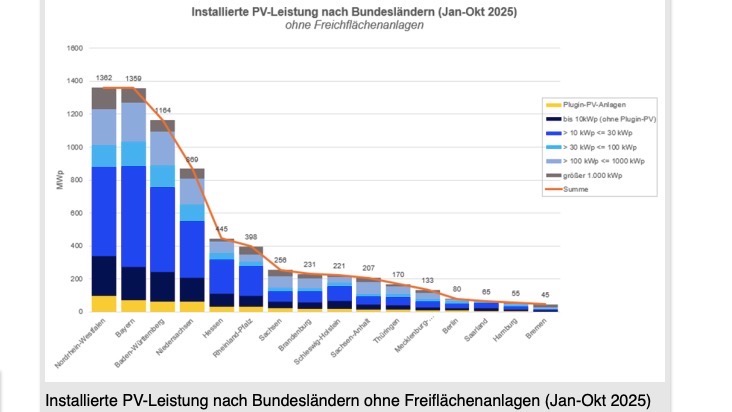Zwar steigt der Photovoltaik-Zubau im Oktober 2025 insgesamt auf 1.046 Megawattpeak (MWp), jedoch markiert der Zubau im PV-Bereich bis 1000 Kilowattpeak (kWp) mit nur 454 MWp den schwächsten Monat seit Ende 2022. Balkonanlagen folgen dem üblichen saisonalen Rückgang, aber insbesondere klassische Aufdachanlagen brechen in nahezu allen Segmenten deutlich ein. Nur Großanlagen ab 1 MWp konnten leicht zulegen und so ein noch schwächeres Gesamtergebnis verhindern.