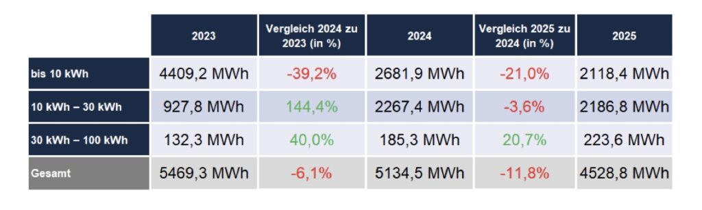 Heimspeicher folgen im Zubau natürlicherweise dem Nachfragetrend privater PV- Anlagen. Der Rückgang wird hier jedoch durch Nachrüstungen und in Relation zur PV-Anlage steigende Speichergrößen statistisch teilweise abgepuffert. Die Entwicklung bei kleinen und mittleren Gewerbespeichern ist im Gegensatz dazu zwar positiv, bleibt aber seit Jahren hinter den Erwartungen der Branche zurück.