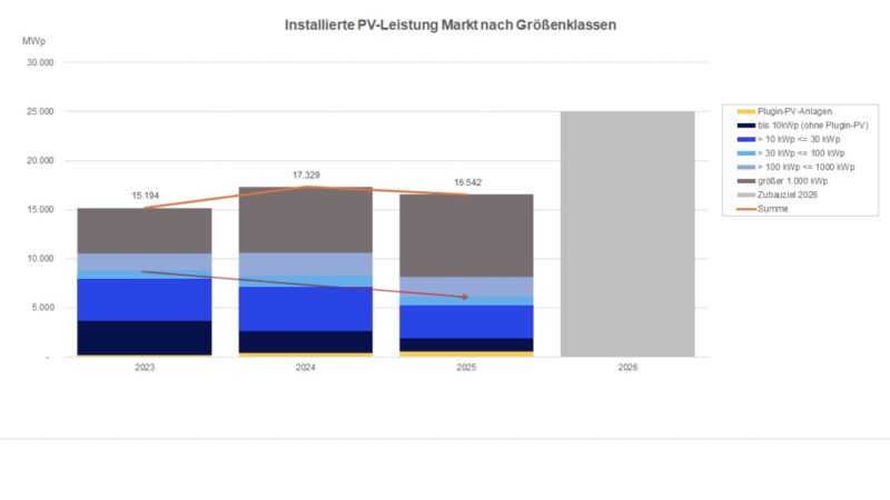 Mit einem Zubau von 1.063 Kilowattpaek (kWp) im Dezember bleibt der Jahreszubau unter dem Vorjahresniveau. Während große Anlagen die Statistik weiterhin stützen, verzeichnet das Segment bis 100 kWp einen deutlichen Rückgang. Im Vergleich zu den Vorjahren zeichnet sich damit eine zunehmend ausgeprägte strukturelle Verschiebung im Markt ab.